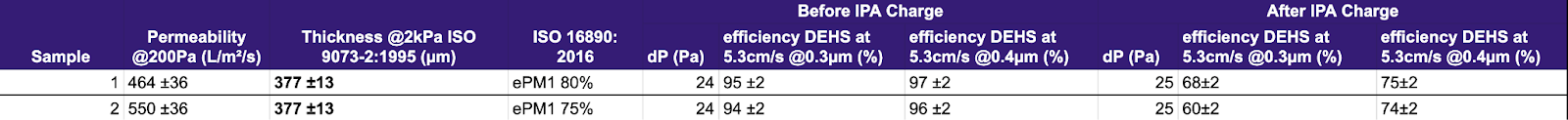 Importantly, the media retains meaningful efficiency after IPA discharge testing demonstrating that performance is not purely charge-driven.